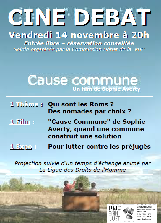 un débat organisé par la MJC Saint-Just à Lyon 5ème, aura lieu autour du film Cause commune, tourné à Indre, petite ville où le conseil municipal s’est posé la question du meilleur comportement à avoir après une arrivée importante de familles Rroms suite à l’évacuation d’un campement situé à Nantes…